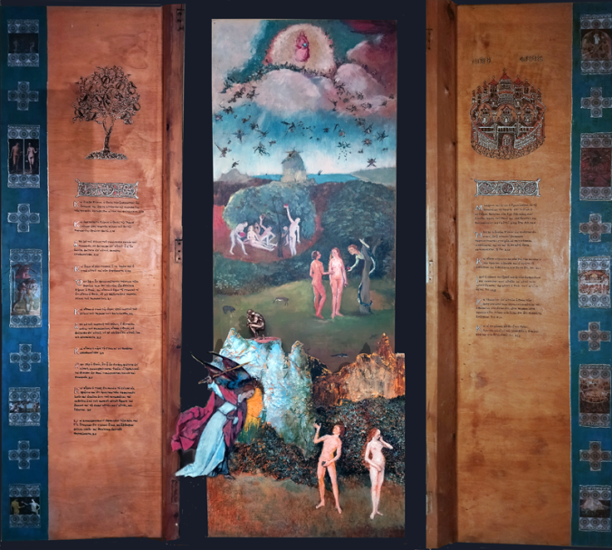- A) Two 150x50cm… cabinet sheets in the form of a manuscript page with 4 crosses and 5 overprinted reproductions of works at the edges. The extracts and images, on the left, relate to the Nativity, while, on the right, to the Revelation of John and the Resurrection.