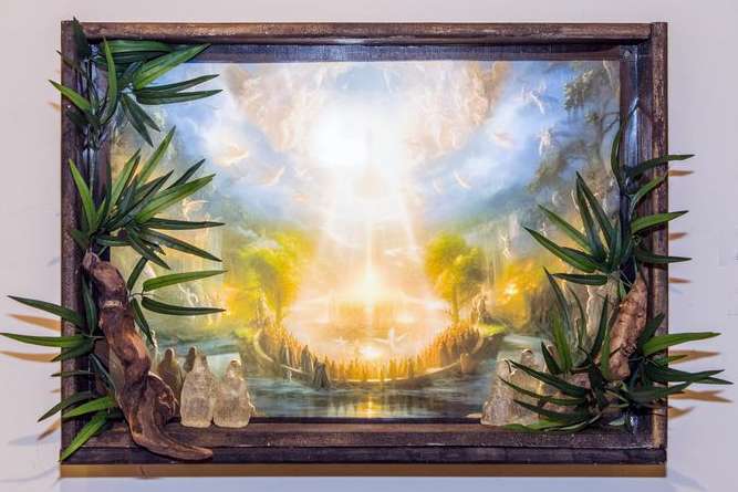 - B) a composite section in the centre: a 48.5 x 100cm panel and a 48.5 x 60 x 10cm box, on which rests a ceramic vase containing soil and the ready-made caganer figure as Rodin’s thinker,. On the left, the angel figure is a laminated, painted reproduction fixed with copper wire at an angle.